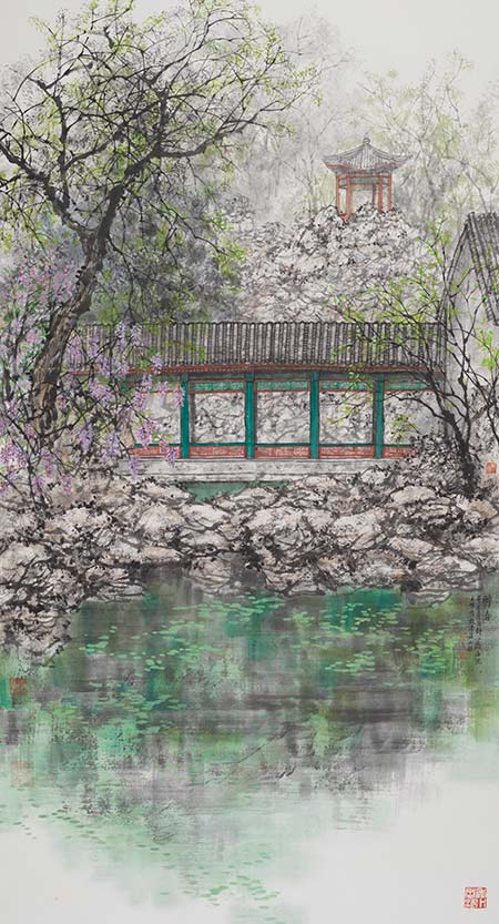 ??這次大型園林系列畫展,用王明明自己的話說是他的衰年之作。他說人老了,心頭的波濤平靜了,目光更加慈祥更加溫和了。有些山在眼里已經不是原來的山了,有些石頭也不是原來的樣子了,湖水平靜了,水里的倒影清晰可見。總之,這個世界在他的眼里變了,他對這個世界的態(tài)度也變了,他的心恬淡平和,他的筆隨意散淡。他的眼前是遮不住的青山隱隱,流不斷的綠水悠悠,是紅顏春老,落花滿地。這也許就是他與以前的不同,一個全新的藝術境界。