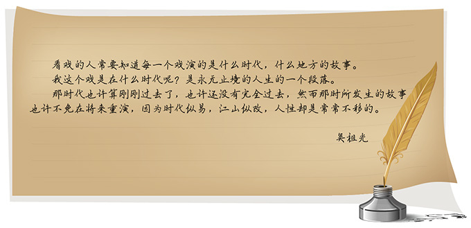 ??這部劇創(chuàng)作于1942年,中國正處于日寇侵略的鐵蹄之下,而當(dāng)時(shí)所流行的文藝作品也大多是感應(yīng)時(shí)代號召所作,但吳祖光卻在那樣一個(gè)轟轟烈烈的時(shí)代,寫出了這樣一部乍看上去有些“脫離時(shí)代”的愛情故事。但實(shí)際上,在《風(fēng)雪夜歸人》中,愛情和戲夢不過是表面的浮華 ,抗?fàn)幒蛦⒚傻闹黝}才是永恒的風(fēng)骨。舞臺的繁華熱鬧、人生的蒼涼底蘊(yùn)、愛情的無常與命運(yùn)的變遷,吳祖光先生正是企圖借助一個(gè)濃墨重彩的愛情故事,來探討人生永恒的真諦,表現(xiàn)小人物的覺醒和他們對命運(yùn)永恒的叩問。