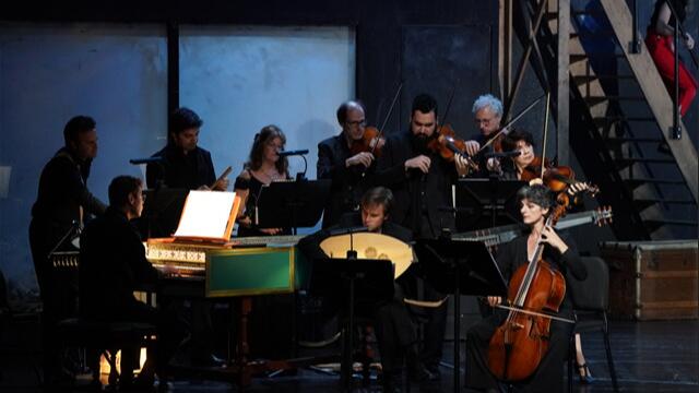 演出開(kāi)場(chǎng),法國(guó)繁盛古樂(lè)團(tuán)的小型樂(lè)隊(duì)在舞臺(tái)一側(cè)進(jìn)行演奏?王小京/攝