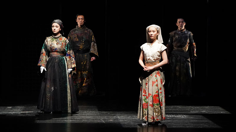 在鈴木忠志的舞臺上,令人最感興趣的莫過于他雜糅了不同國家文化的要素。在此版《李爾王》中,除了五國演員使用母語演出外,整部劇的背景音樂、服裝造型也充滿了跨文化的國際性?!胺b使用了很多國家的素材,日本和歐洲的服飾元素雜糅其中,觀眾也能從劇中聽到巴赫、柴科夫斯基的音樂元素。使用多個國家的優(yōu)秀文化元素,讓它們在舞臺上碰撞融合,是我的戲劇觀念。”鈴木忠志說道。