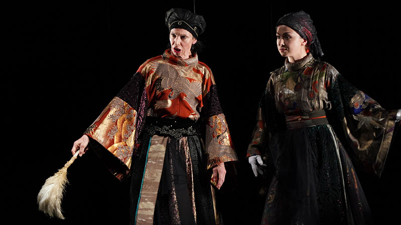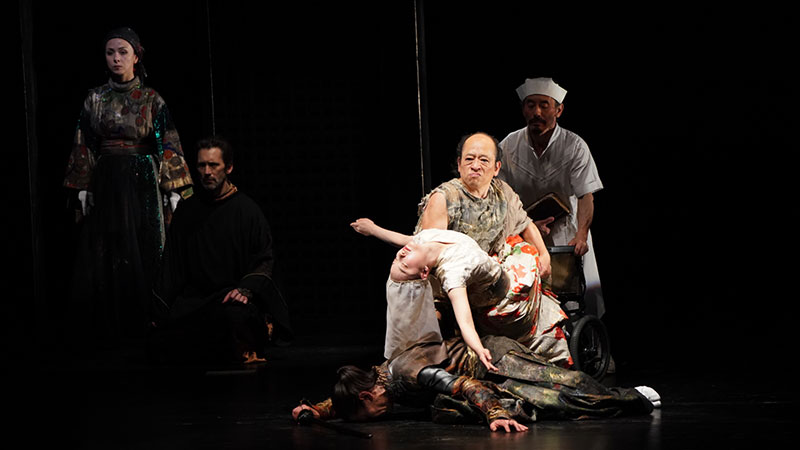 在當晚的舞臺上,燈光暗下,“李爾”坐著輪椅緩緩步入舞臺,垂垂老矣的他孤獨地住在醫(yī)院里,身旁的護士念著《李爾王》的故事,他則借此追憶自己的一生。舞臺上演員在大部分時間里都保持上身端直,行走時滑行的腳步近乎無聲,動靜有致發(fā)聲沉穩(wěn)。在最初的版本中,李爾王的三個女兒均由男演員飾演,與日本能劇的演出傳統(tǒng)和莎士比亞時期的演劇傳統(tǒng)一致。而在此次復排中,三位女兒分別由來自美國、俄羅斯與中國的女演員共同演繹,不同語言及文化背景的演員以“鈴木訓練法”的統(tǒng)一規(guī)則為橋梁,打破了異質文化的藩籬,獨特的表演方式也深深吸引著每一位觀眾。